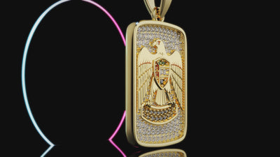 A handcrafted piece made in solid 18kt gold, featuring a precise composition of ruby, diamonds, and emerald. Each gemstone is selected for clarity and calibrated weight, creating a balanced interplay of red ruby brilliance, diamond sparkle, and a subtle accent of emerald green. The Eagle of Noor embodies the prestige, uniting and masterful goldwork with a refined blend of precious Red, Green, White and Black gemstones to evoke strength, radiance, and elevated elegance.